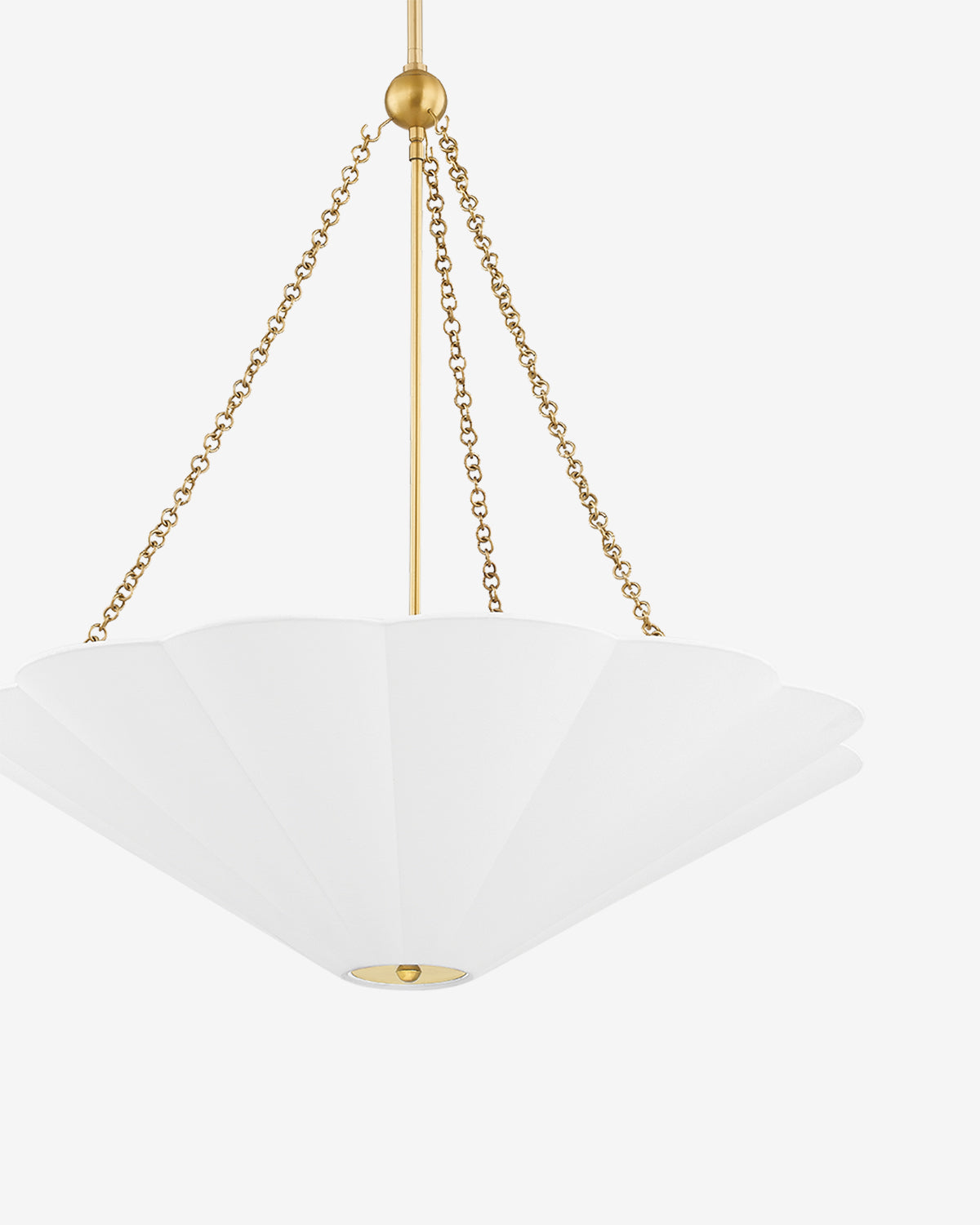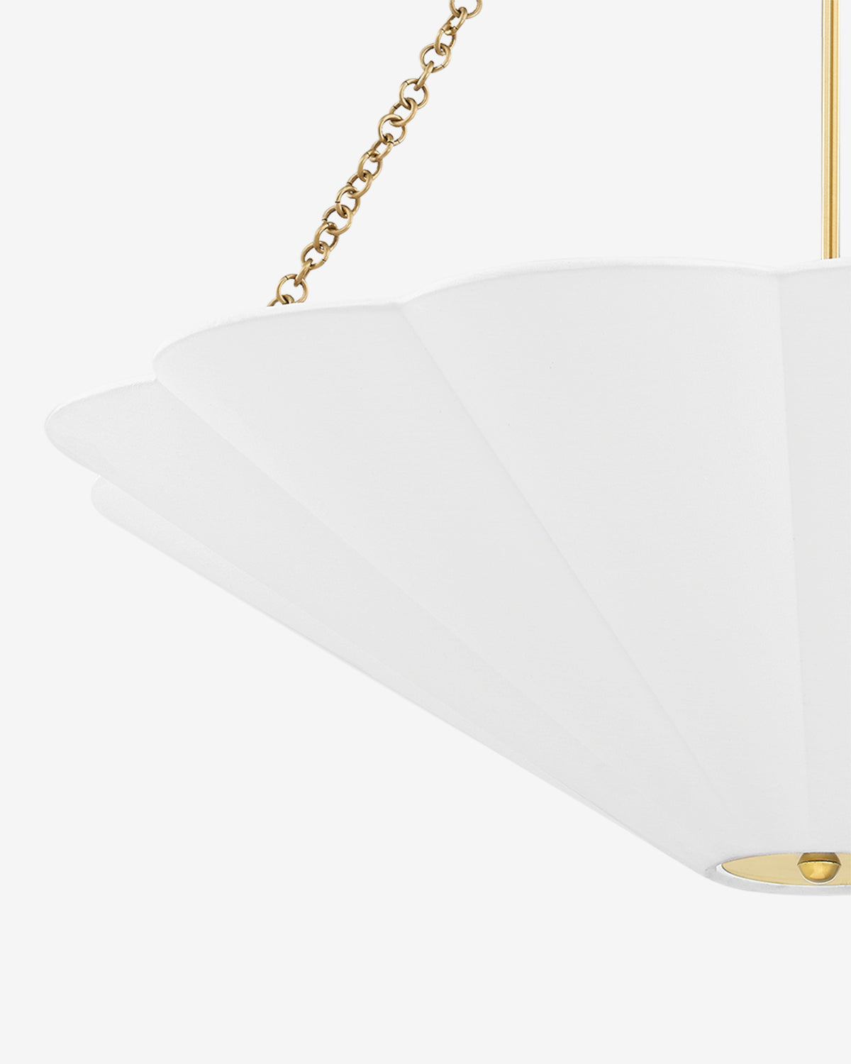 Featuring a unique inverted shade, the Alana Pendant is crafted from antiqued brass and white linen. Its shade is pulled upward by delicate chains, and a small round brass finial peeks out from the bottom. The shade is scalloped, pulled tight to create a crisp, clean feel. With an elegant yet playful tone, the Alana Pendant is damp rated to suit nearly any space in the home.